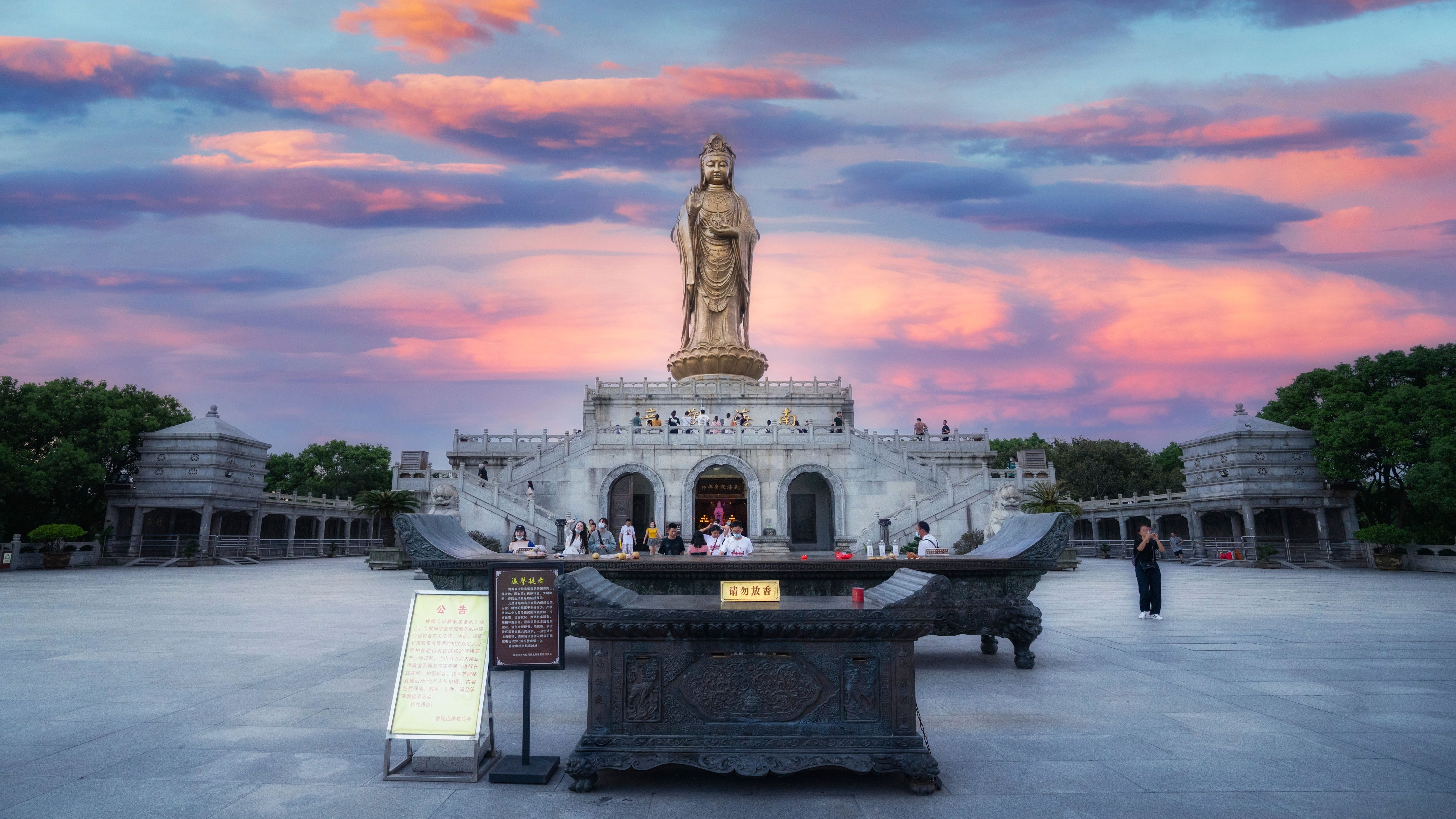 佛顶山上,千步沙,百步沙都是普陀山上看日出日落比较不错的地方。在这里可以看到最美的日出,奔赴一场海上的温柔。另外磐陀夕照就是著名的普陀十二景之一。每当夕阳西下,石披金装,灿然生辉,此时登上石顶详细远眺则山海增辉,彩霞满天,景色之壮美令人惊叹。
